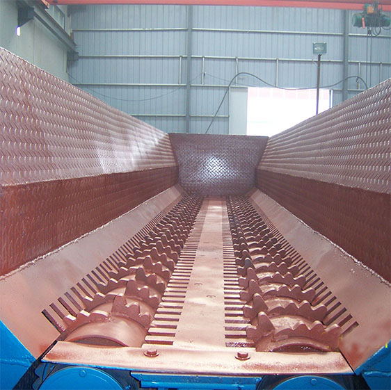 采用敞開(kāi)料倉(cāng),一頭進(jìn)料,另一頭出料的流水線式作業(yè),克服了現(xiàn)有剝皮機(jī)停電進(jìn)料、出料,分段式工作方式的缺點(diǎn),工作效率高。